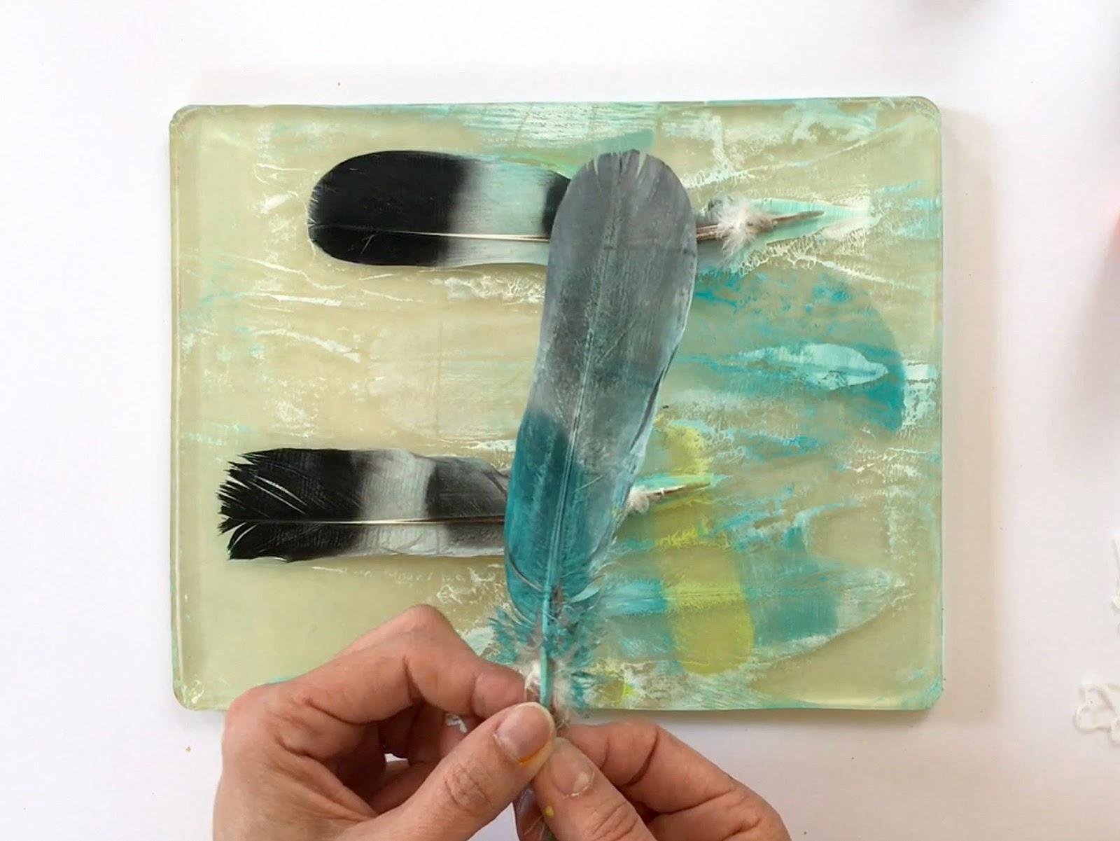 Now add a new layer of paint to the plate and layer stencils on top. Use a sheet of printer paper to remove the paint from the open spaces. Then remove the stencils from the plate and place the painted feathers on top of the remaining paint.